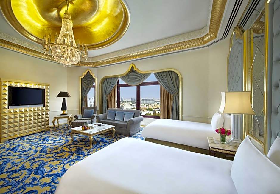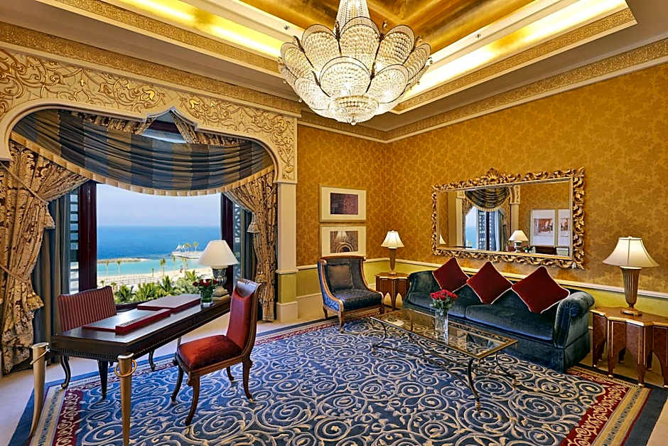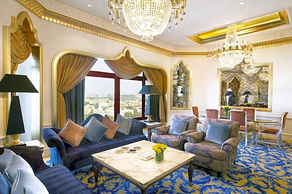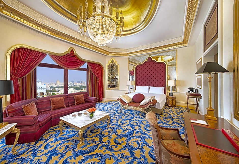 1,000 square yard, spacious suite with two bedrooms, balcony views, living and dining rooms, office, maid room, kitchen, six bathrooms, Jacuzzi, sauna and fully-equipped fitness center with gymnasium and a customized butler service. Each bedroom features one king-size bed, an armchair with ottoman style, desk, mini-bar, daily newspaper delivery, DVD player, bathrobe, slippers and complimentary hot breakfast. The bathrooms offer a separate bathtub and walk-in shower, as well as complimentary designer toiletries.