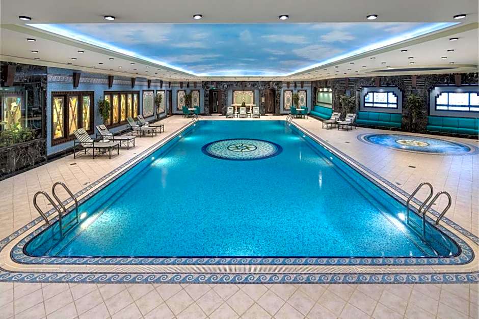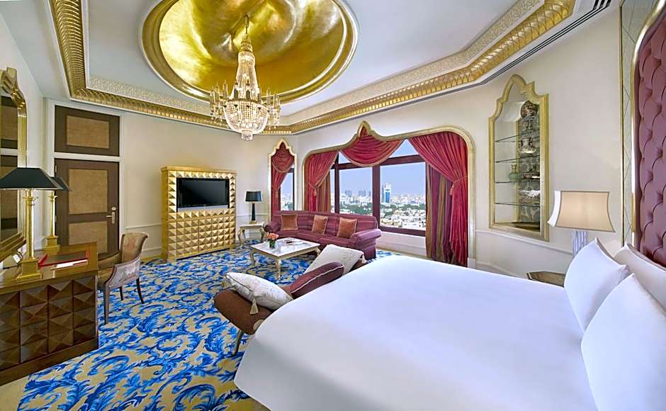 1,000 square yard, spacious suite with two bedrooms, balcony views, living and dining rooms, office, maid room, kitchen, six bathrooms, Jacuzzi, sauna and fully-equipped fitness center with gymnasium and a customized butler service. Each bedroom features one king-size bed, an armchair with ottoman style, desk, mini-bar, daily newspaper delivery, DVD player, bathrobe, slippers and complimentary hot breakfast. The bathrooms offer a separate bathtub and walk-in shower, as well as complimentary designer toiletries.